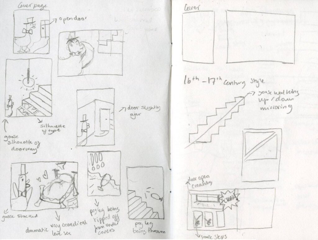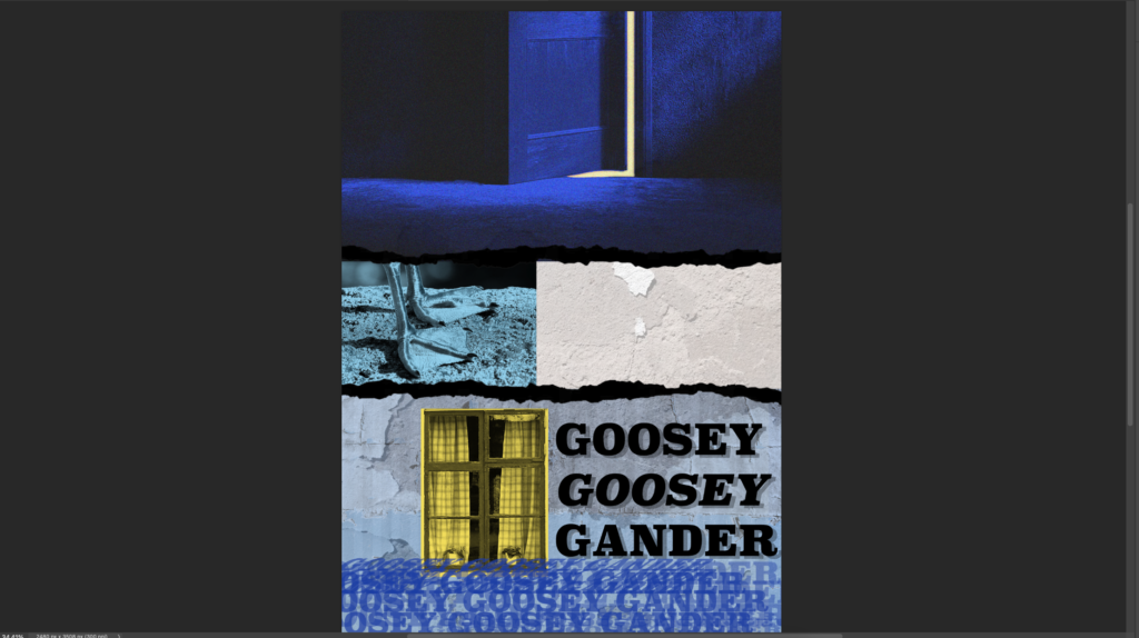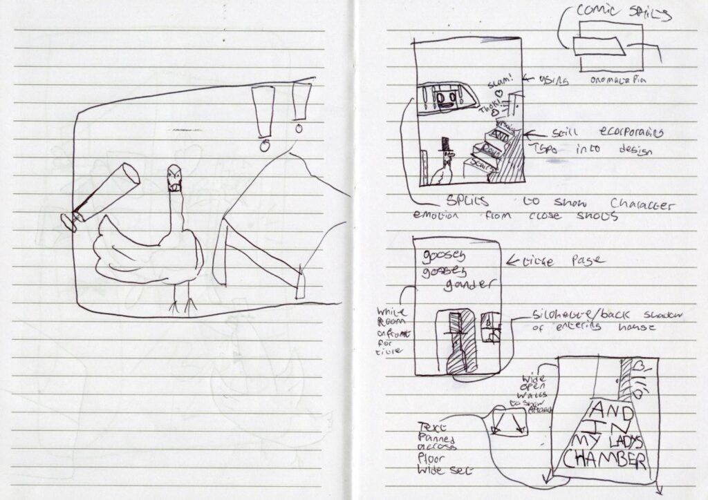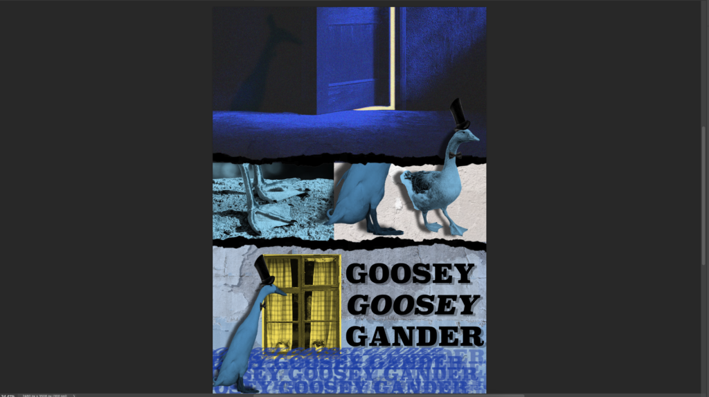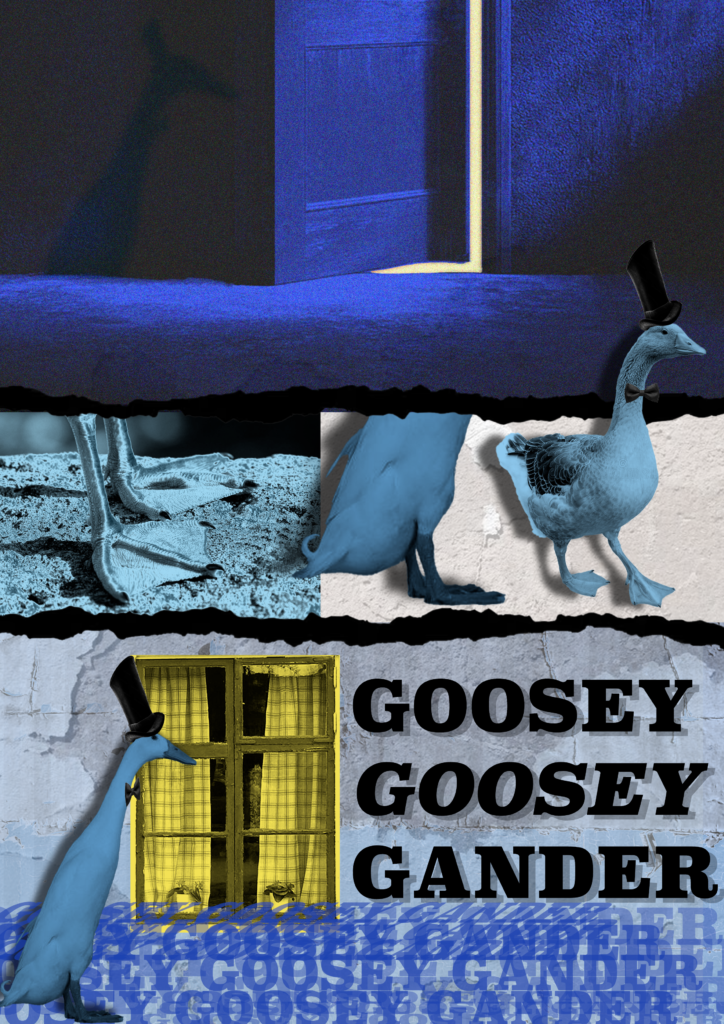 Me and my Classmate Irene have been assigned to make a comic zine from the old nursery rhyme “a Goosey Goosey Gander”. For the comic we had to make 8 pages containing imagery and lines retaining to the rhyme. We decided on splitting the work between the two of us equally and do 4 pages each of the comic while matching eachothers graphical design abilities. If there was something one of us didnt know the other would teach it.